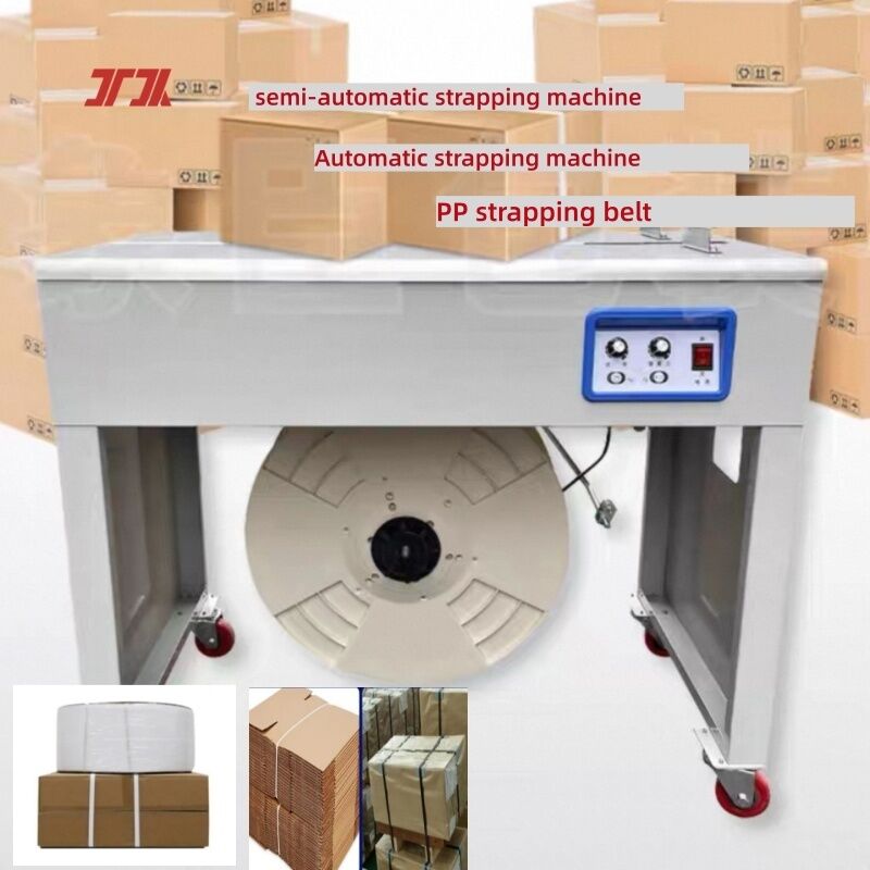 Semi-automatic strapping machines require manual placement of the strapping belt on the packaging; the machine then automatically tightens, seals, and cuts the belt.
